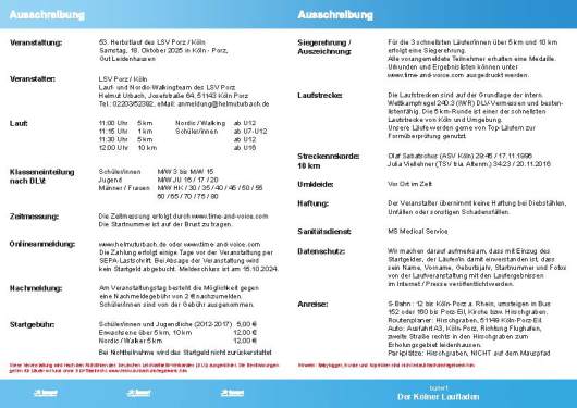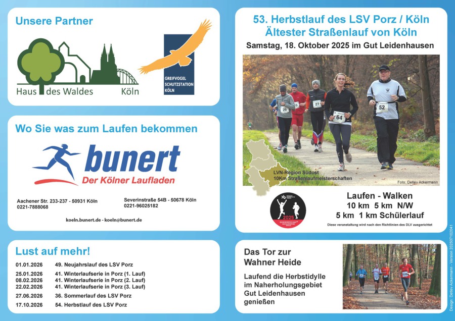 Ambitionierte Läufer auf Bestzeitjagd, als auch Freizeitjogger können hier auf Distanzen zwischen 1 km und 5 km die Laufstrecken unter die Füße nehmen. Der Sommerlauf des LSV Porz ist beim