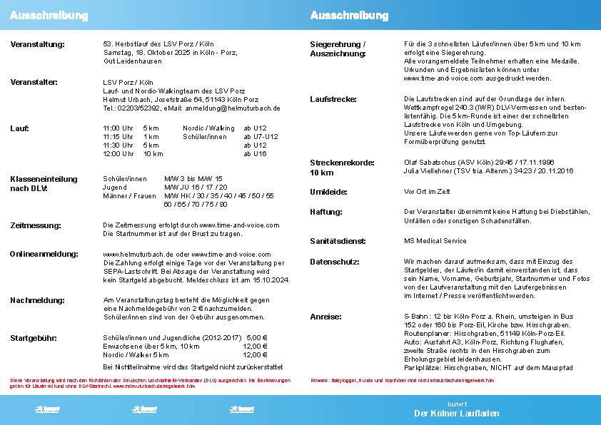 Leichtathletikverband angemeldet und durch ihn genehmigt. Die Streckenvermessung (5 km und 10 km) erfolgte durch einen anerkannten Streckenvermesser des DLV, die Distanzen sind somit
