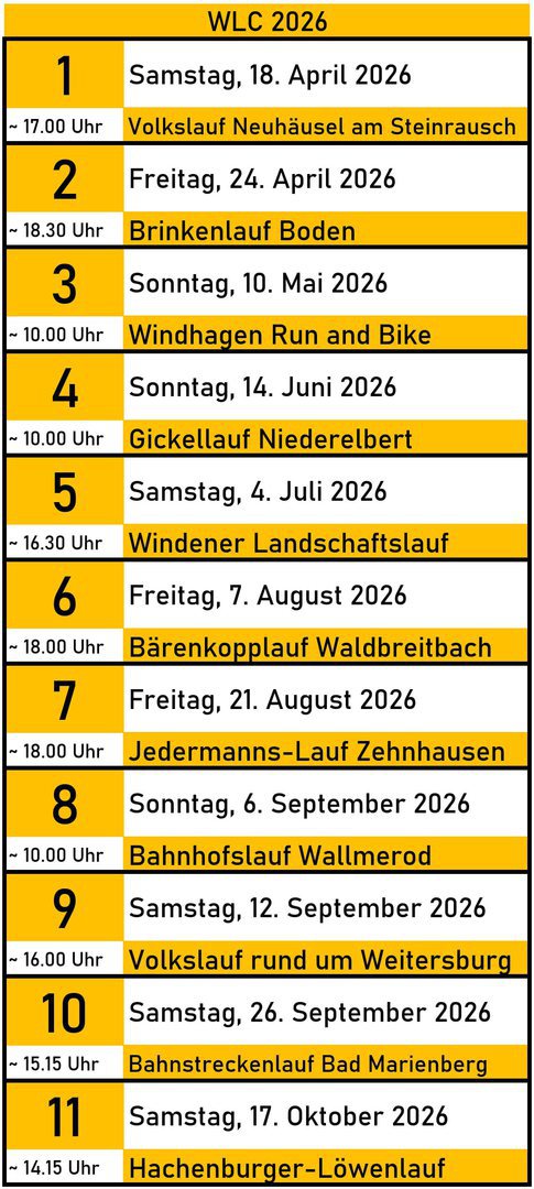- Um in die Gesamtwertung zu gelangen, ist die Teilnahme an mindestens drei der genannten Volksläufe Pflicht.
