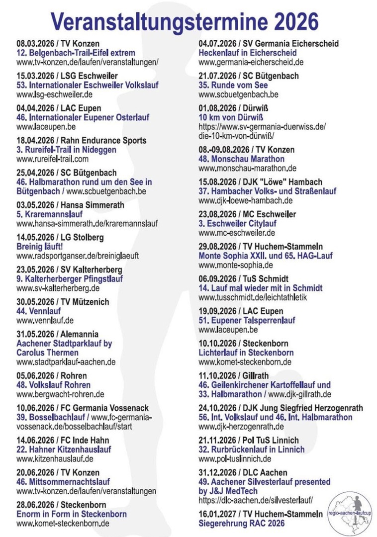 Jeder Läufer kann am Regio Aachen Cup (RAC) teilnehmen. Eine Wertung erfolgt nach 5 absolvierten Läufen bei 5 verschiedenen Cup-Veranstaltungen.